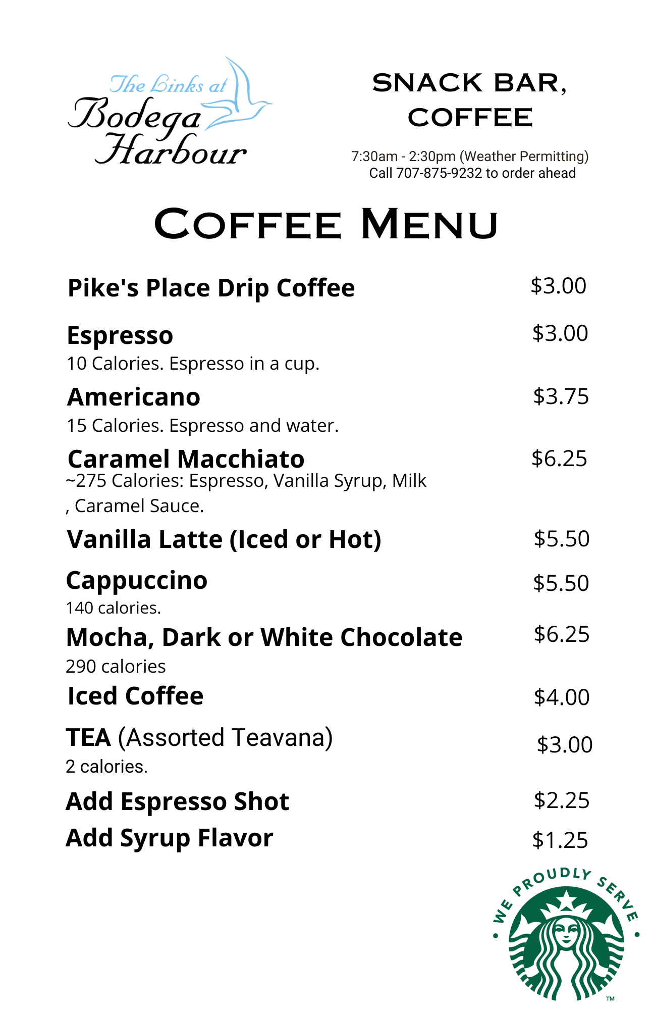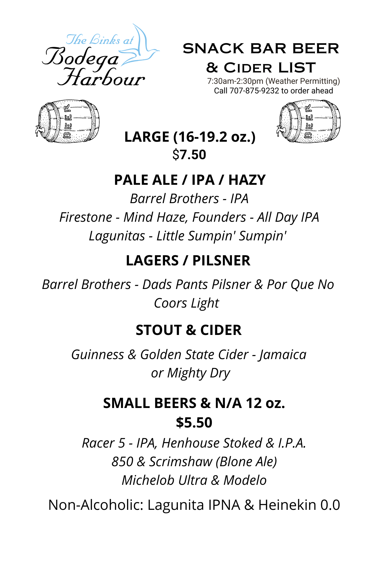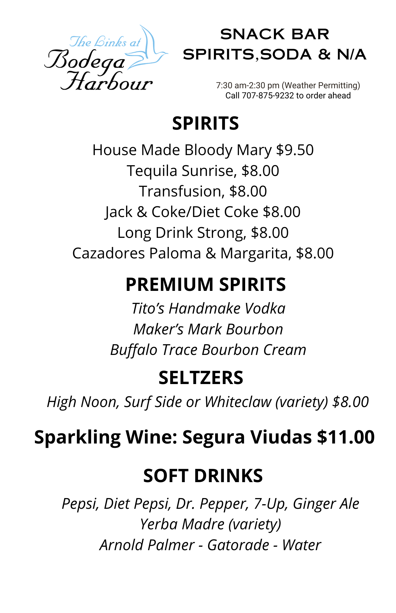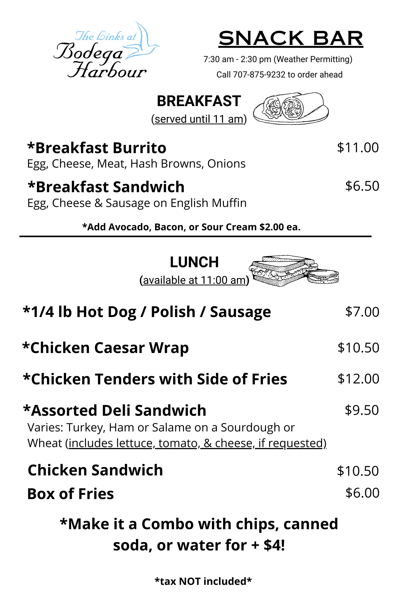 The Links at Bodega Harbour Snack Bar is available daily from 7 A.M. to 2:30 P.M. (weather permitting).